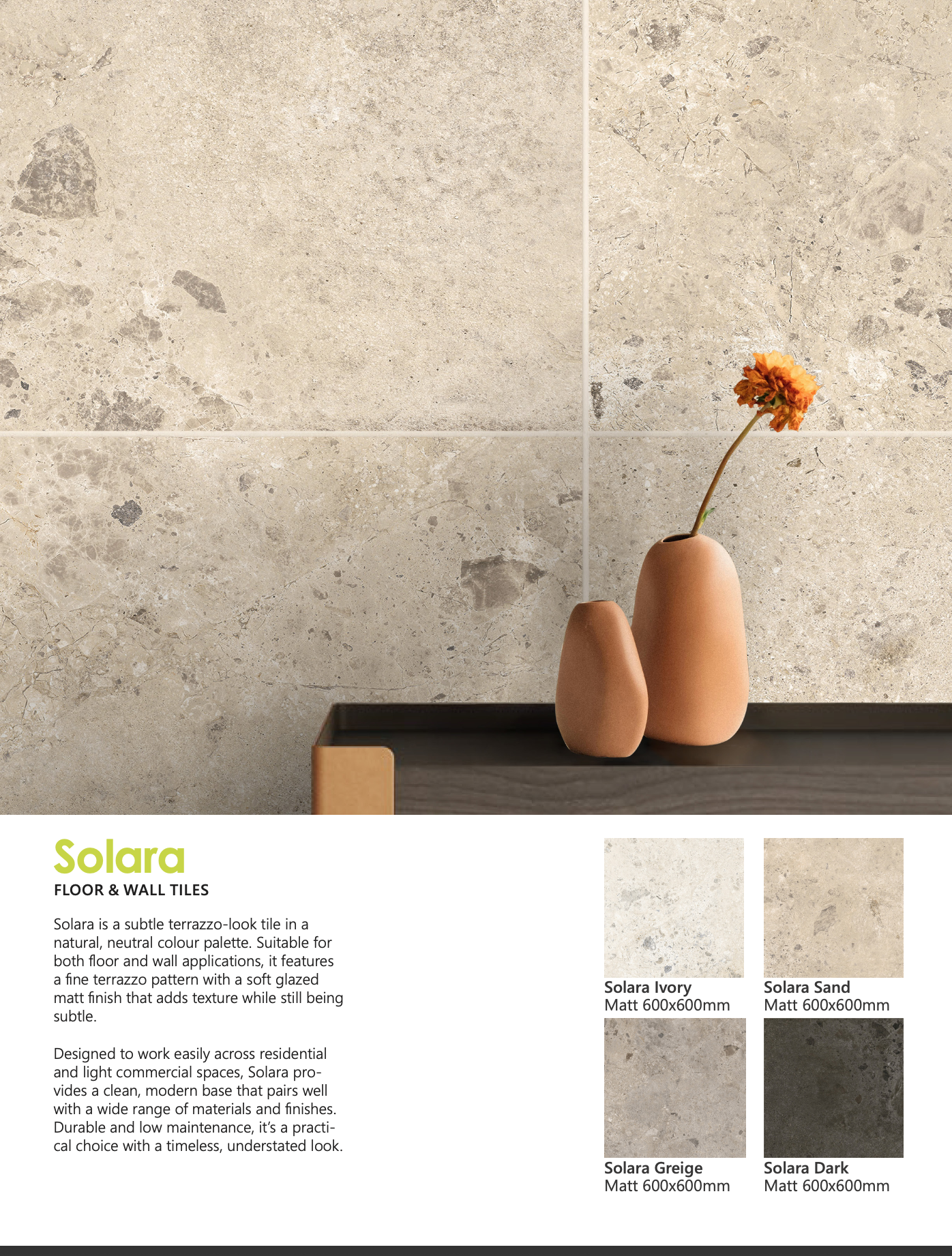 Solara is designed for versatility — equally at home in bathrooms, kitchens, living areas, hallways, and open-plan spaces. Durable, low-maintenance, and timeless in its appeal, this collection pairs beautifully with timber, concrete, matte-black fixtures, brushed metals, and natural textiles.